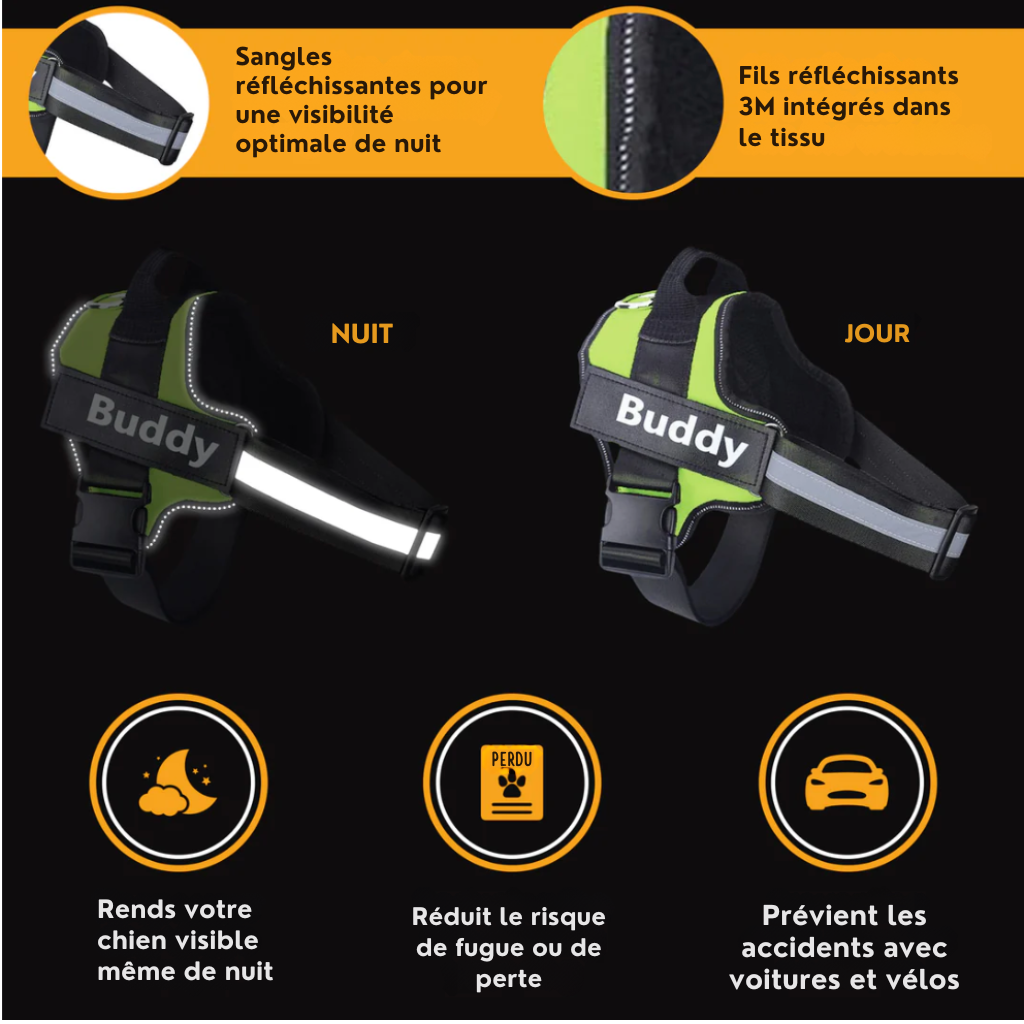Absolument. Le harnais est conçu pour répartir la pression uniformément autour de la poitrine de votre chien, évitant ainsi toute gêne ou douleur. Il est également équipé de coutures réfléchissantes pour une visibilité accrue lors des promenades nocturnes.