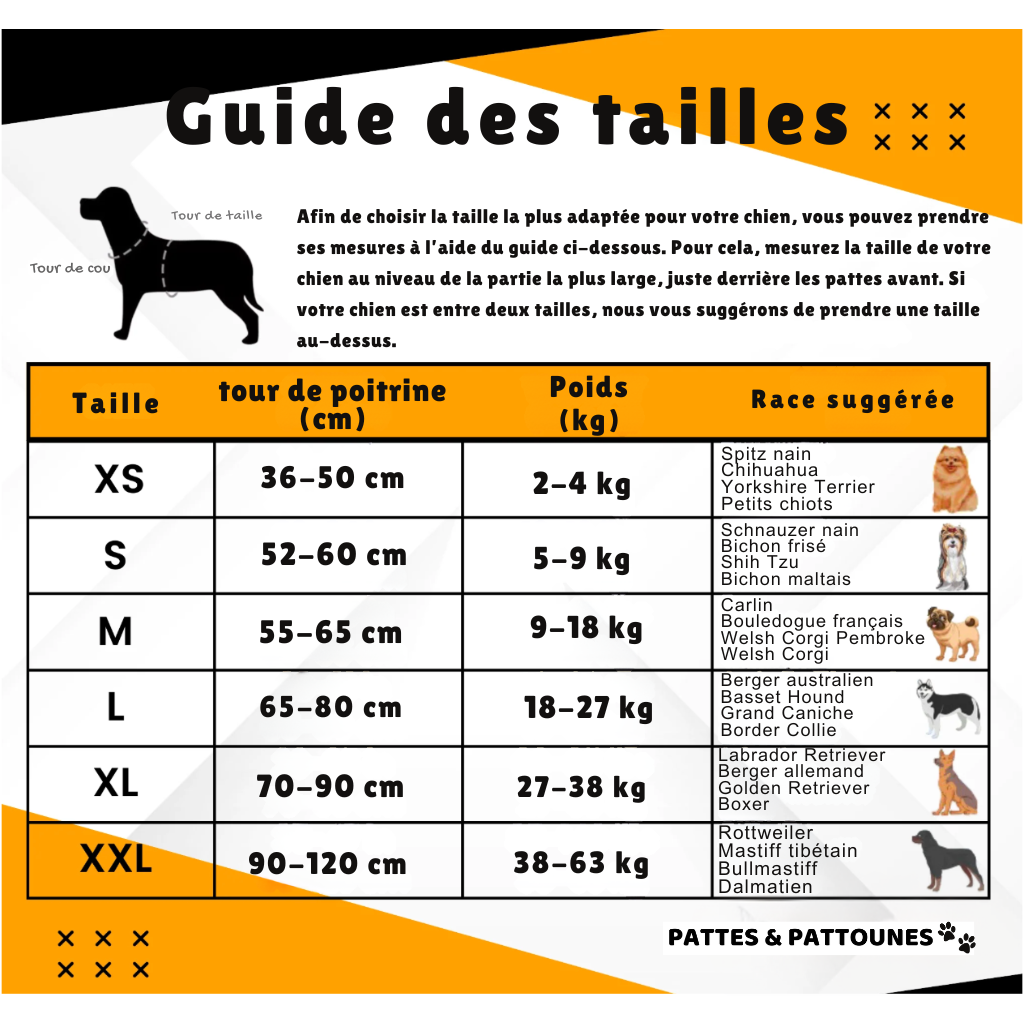 Si votre chien est entre deux tailles : Nous recommandons de prendre la taille au-dessus pour un confort optimal.