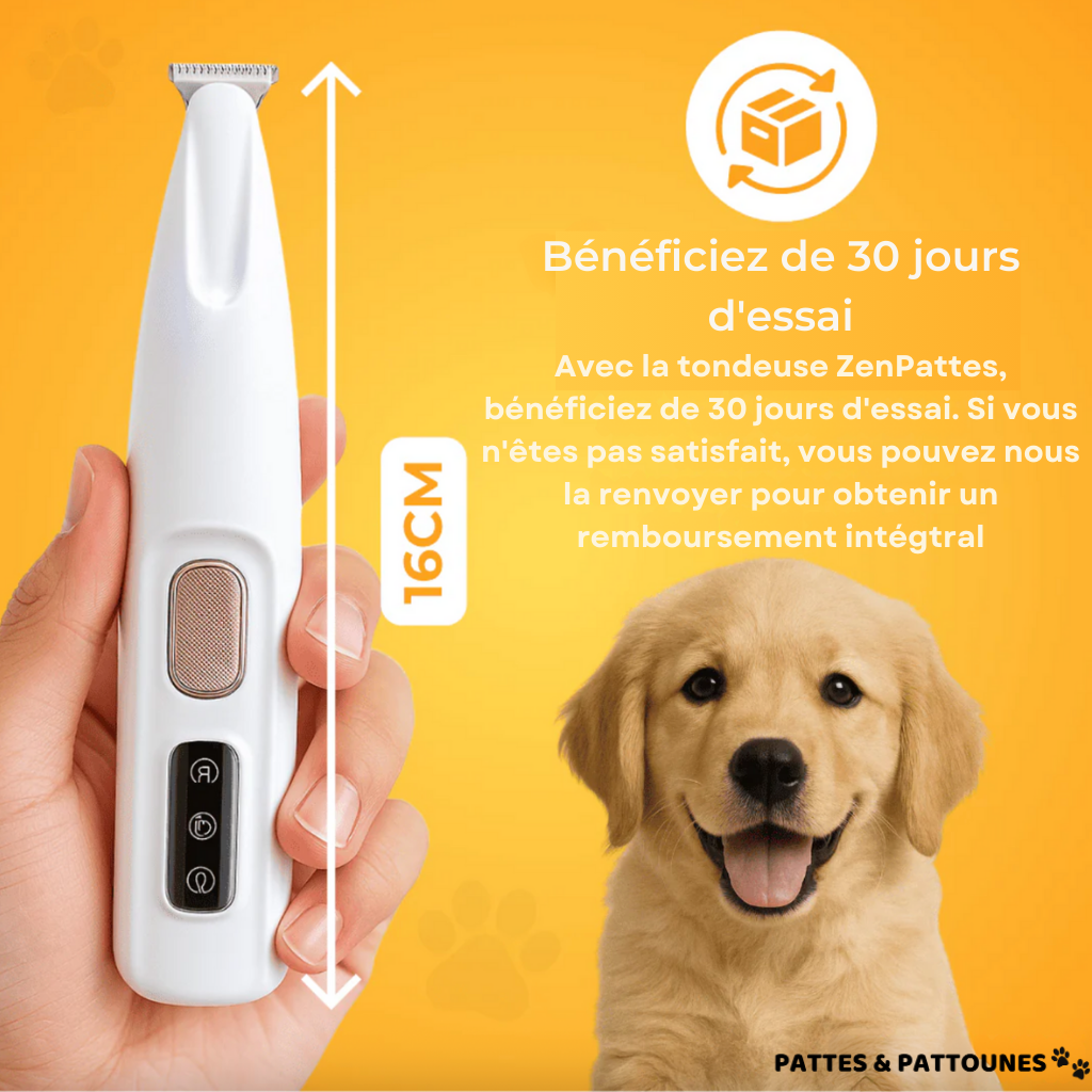 Oui, la ZenPattes convient aux chiens et aux chats de toutes tailles. Elle est parfaite pour l'entretien des pattes, du museau, des oreilles, du contour des yeux et de l'arrière-train. Attention : cet appareil est conçu pour les finitions et les zones délicates, pas pour tondre l'intégralité du corps de votre animal.